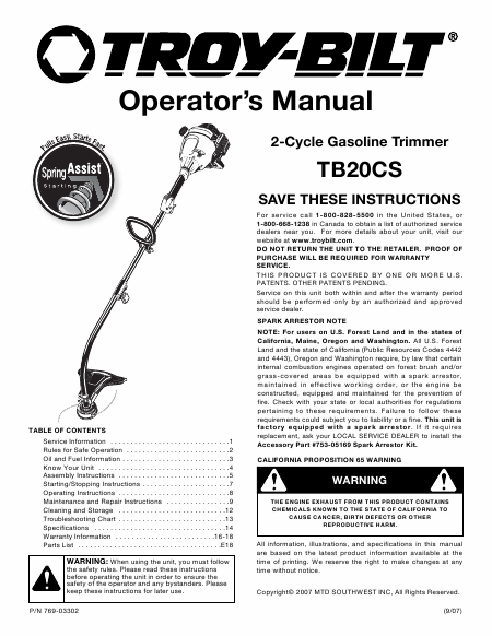 Telecharger TROY-BILT TB20CS Mode emploi Espagnol (18 Pages) 12.90 EUR