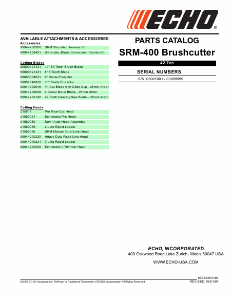 Scaricare ECHO SRM-400 Lista parti di ricambio Inglese (20 Pagine) 15.90 EUR
