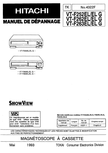 Descargar HITACHI VT-F252EL Manual de taller Francés (125 Páginas) 39.90 EUR
