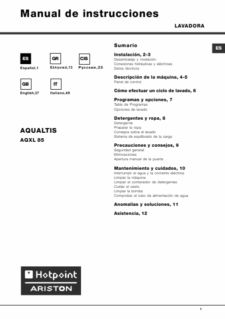 Baixar ARISTON AQXL 85 Aqualtis Instruções Inglês (12 Pages) 12.90 EUR