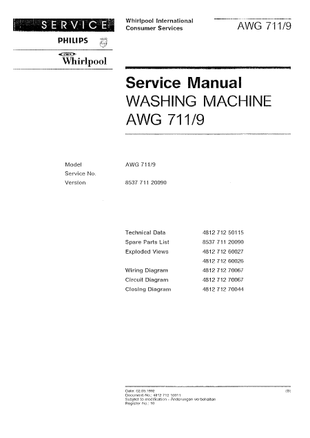 WHIRLPOOL AWG 711 (AWG711) Manuale di servizio Inglese
