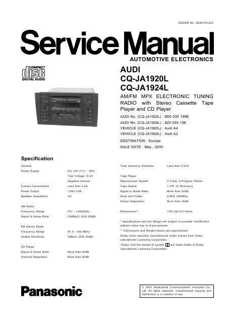AUDI CQ-JA1920L (Audi Symphony - Panasonic) Service Manual English