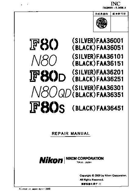 Telecharger NIKON N80QD Manuel de service Anglais (130 Pages) 39.90 EUR