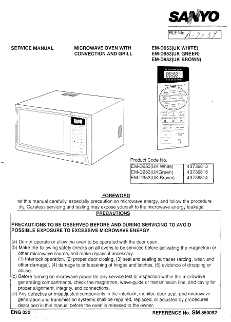 Telecharger SAMYO EM-D953 Manuel de service Anglais (26 Pages) 15.90 EUR