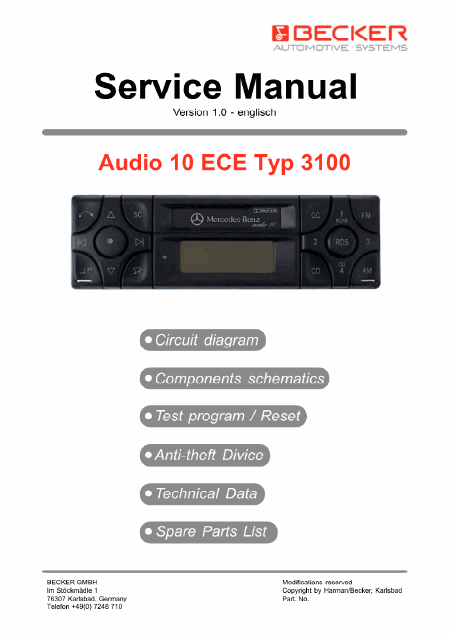 BECKER Audio 10 ECE Typ 3100 Manuale di servizio Inglese