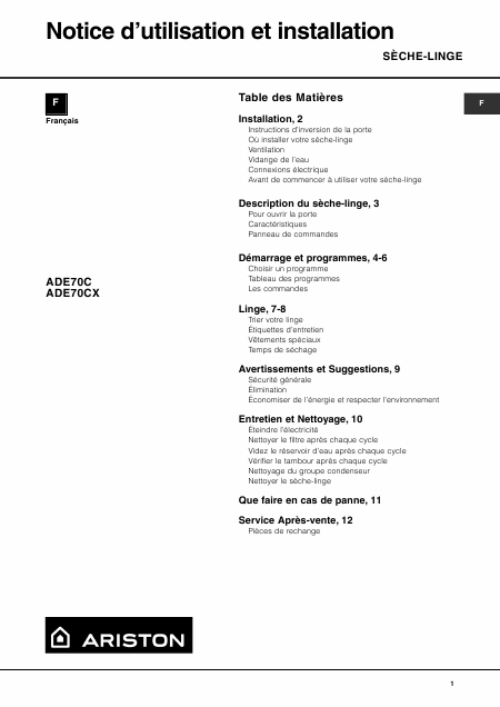 Baixar ARISTON ADE70C / ADE70CX Instruções Francês (12 Pages) 12.90 EUR