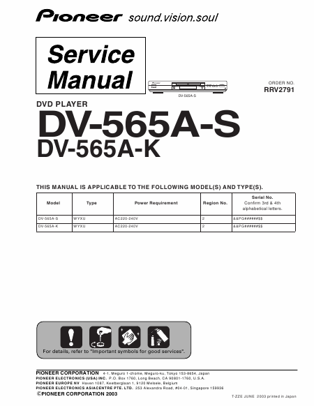 PIONEER DV-565A (S/K) Manuel de service Anglais
